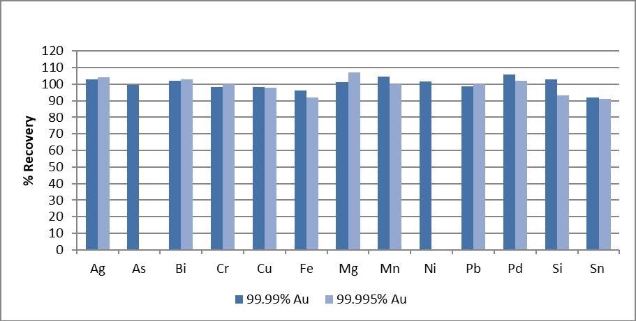In order to determine accuracy, external calibration curves were measured against 1% gold solutions that were spiked at the specification levels for 99.99% and 99.995% gold.