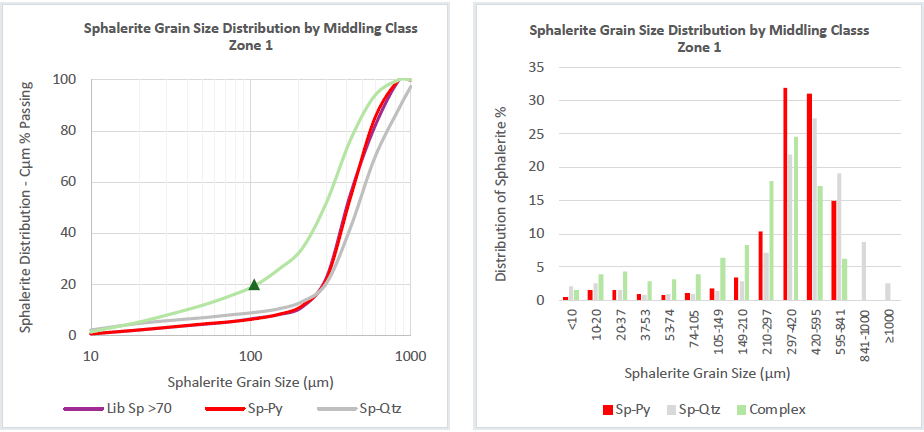 The p20 (20 % passing) size for sphalerite in complex middlings was found to be approximately 100 µm and 40 µm in Zones 1 and 2, respectively, indicating the potential regrind size requirements.