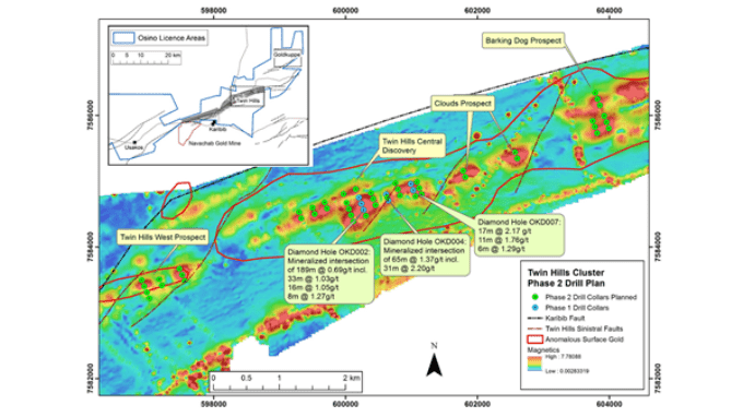 Phase 2 drill collars at Twin Hills Cluster superimposed on magnetics. (Image credit: Osino Resources Corp.)