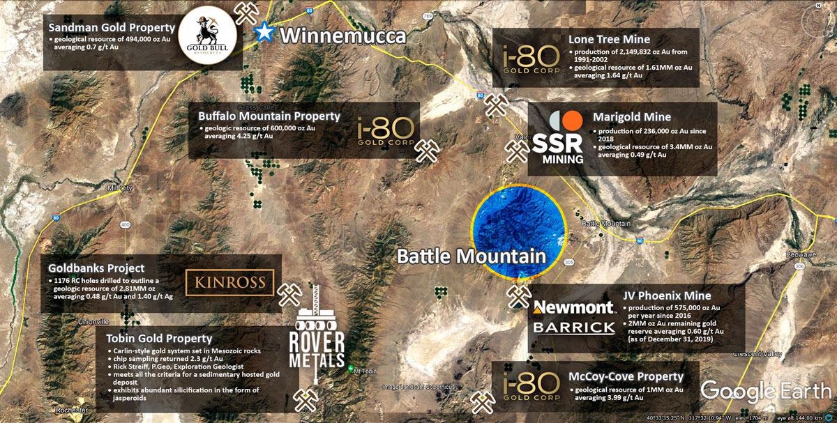 Rover has obtained a 100% interest in the Tobin Gold Project (“Tobin”) that contains 68 claims within BLM land, for a sum of 1,405 acres (or 569 hectares). Set in Mesozoic rocks, Tobin is a Carlin-style gold system. The project is situated about 40 km from the functioning Phoenix Gold Mine that is held by Nevada Gold Mines — a joint venture between Newmont and Barrick.