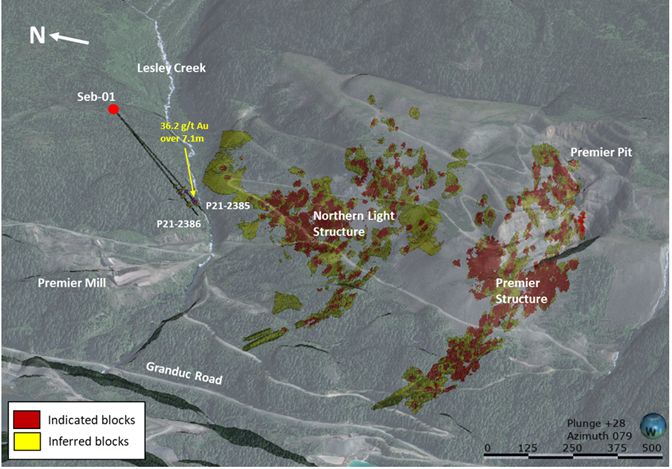 In addition to past drilling, the new gold intercepts appear to point to the possibility of a third arcuate structure comparable to the Premier and Northern Light structures directly to the south. The high-grade intercepts are barely 600 m east of the Premier Mill structure, at a comparable height.