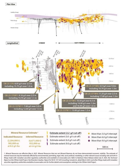 Matt Manson, President & CEO, commented: "Today's drill results illustrate the extension of classic, high-grade O'Brien gold mineralization across a broad front. We are reporting the first high-grade intercepts beneath the western portion of the historic mine, with drill hole OB-25-376W1 extending mineralization 160 meters below the former mine in this area. Drill hole OB-24-337W11 demonstrates continuity of high-grade mineralization below the main stope of the historic mine. Of particular note, drill holes OB-25-371W4 to W6 returned high-grade mineralization on the western edge of the deep extension of Trend #2, close to the observed extension of Trend #1 (Figures 1&2). This suggests that the apparent gap between these two trends is a function of drill coverage rather than geology, as we have suspected. Closing this gap with new drilling is a priority. With a fully-funded 140,000-meter drill program ongoing and an increase in rigs from the current four to an eventual eight, we are casting a wide net at O'Brien and seeing consistent success."