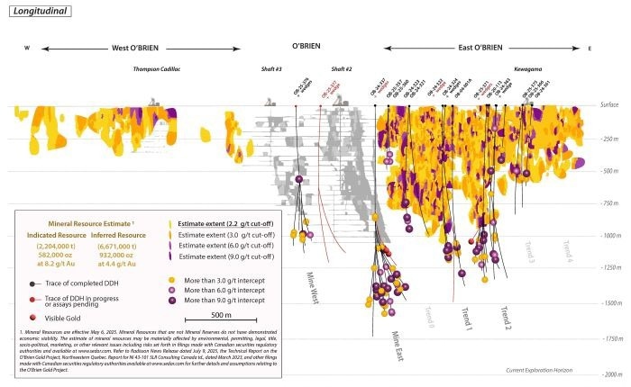 Today's results also include the first drill holes located below the western portion of the historic O'Brien Gold Mine, designated "O'Brien Mine West". As with the main mining area, no exploration had been conducted below O'Brien Mine West since operations ended in 1957. From pilot hole OB-25-376 and wedge branches W1 to W5, five holes returned intercepts with grades and thicknesses consistent with the Project's mineral resources, including OB-25-376W1, which intersected 9.16 g/t Au over 2.5 meters, including 14.70 g/t Au over 1.1 meters (Figure 1). This now extends gold mineralization at O'Brien Mine West 160 meters below the base of the former mine workings (Figure 4).
