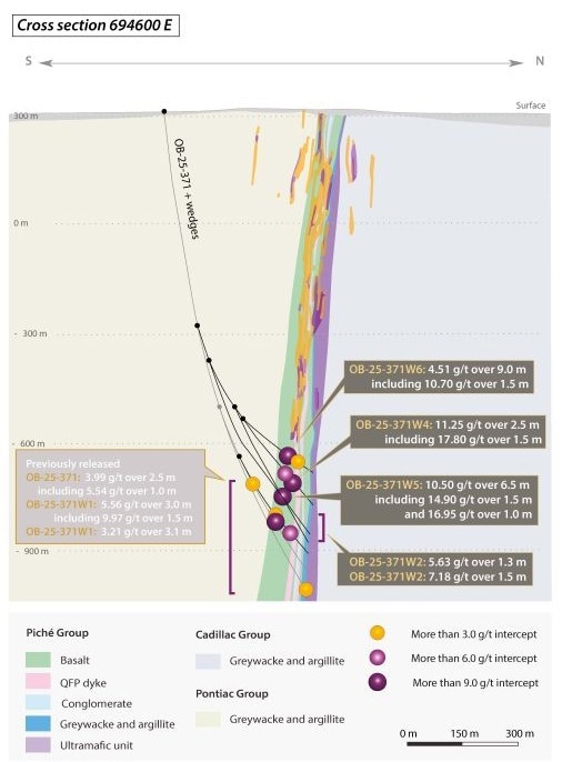 - OB-25-371W5 intersected 10.50 grams per tonne ("g/t") gold ("Au") over 6.5 meters, including 14.90 g/t Au over 1.5 meters and including 16.95 g/t Au over 1.0 meter