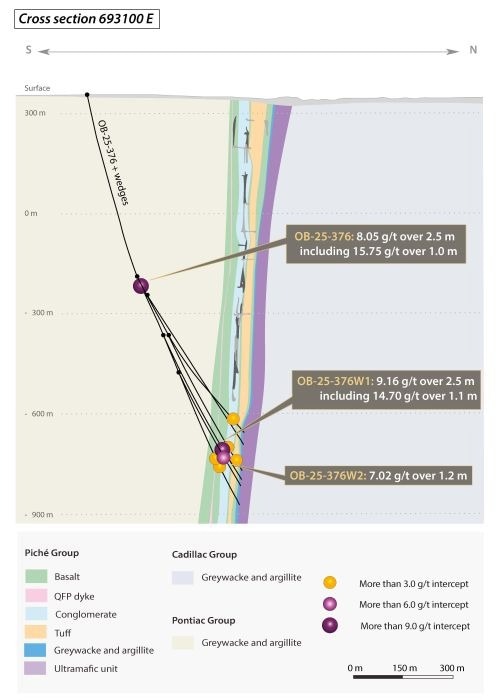- OB-25-376W1 intersected 9.16 g/t Au over 2.5 meters, including 14.70 g/t Au over 1.1 meters