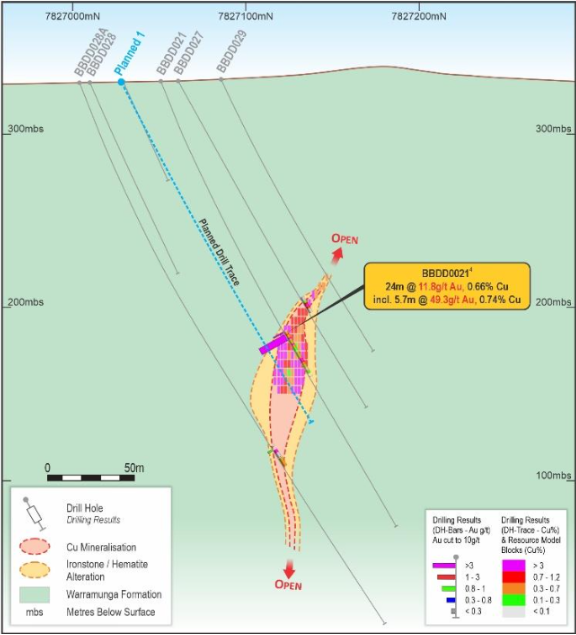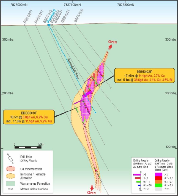 The new drilling will include pre-collars and up to 400 m of diamond tails and will aim to better define and expand the current gold zone. The drilling will also produce HQ drill core for a bulk sample for an advanced metallurgical test-work program focussed on enhancing and optimizing gold recovery. The previous flotation test-work was on copper rich, lower gold grade core from diamond drillholes BBDD0045 and BBDD0046. This work demonstrated excellent copper recoveries of up to 90 % into concentrate grading 24 to 29 % copper. Gold reporting to the copper concentrate showed recoveries of up to 79 % Au.