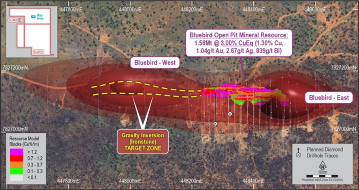 Figure 2. Plan view of Bluebird showing Mineral Resource block-model (OCT 2025), planned drill-collar locations and projected drill trace on gravity inversion model, existing drilling, and projected western extension target zone. Image Credit: Tennant Minerals Limited