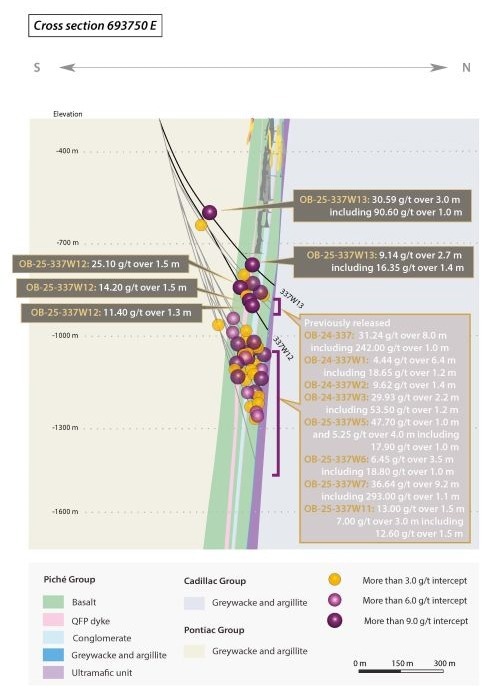 - OB-25-337W13 intersected 90.60 grams per tonne ("g/t") gold ("Au") over 1.0 meter within a mineralized interval averaging 30.59 g/t Au over 3.0 meters and 9.14 g/t Au over 2.7 meters, including 16.35 g/t Au over 1.4 meters;