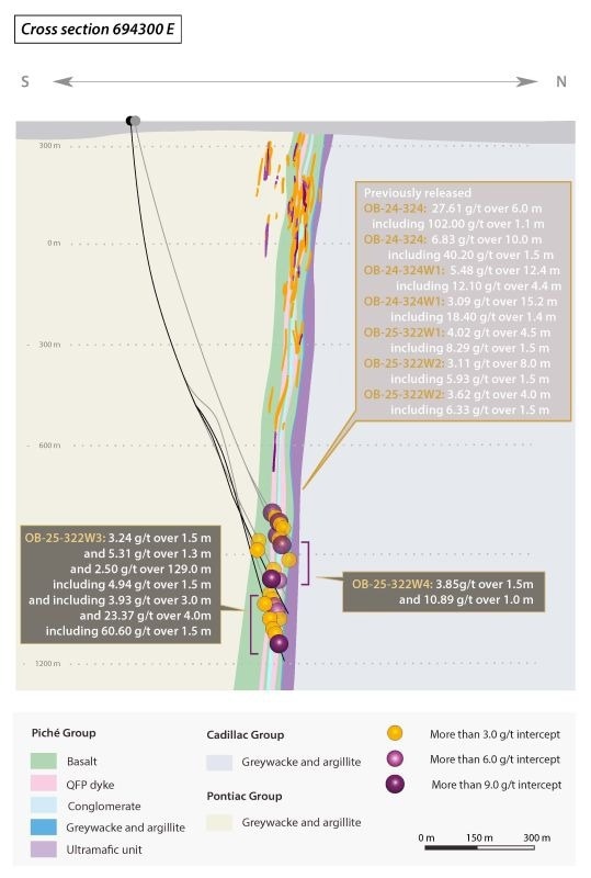 - OB-25-322W4 intersected 2.37 g/t Au over 11.5 meters including 10.89 g/t Au over 1.0 meter;