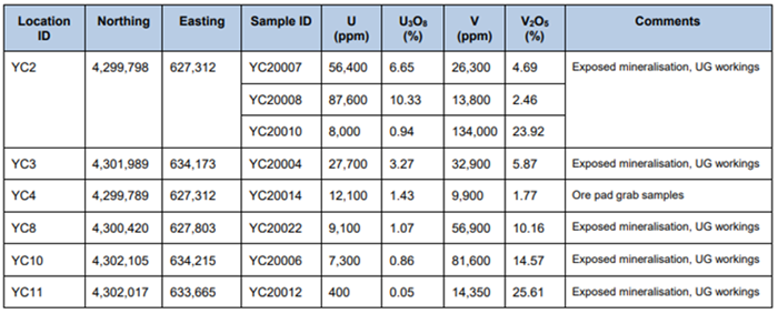 Table 1. Selected rock chip assay results for Uranium and Vanadium sampled by SRK at Anson's Yellow Cat Project. Source: Anson Resources Ltd