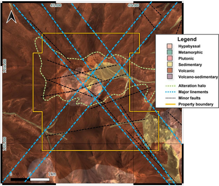 The Potrero Project is located approximately 50 km southeast of El Salvador and approximately 20 km north of Kinross’ La Coipa gold-silver mine in a well-established mining district hosting Kinross’ Lobo mine, Gold Fields’ Salares Norte gold mine, and Rio2’s Fenix gold project (see Figure 1). The Project comprises a contiguous package of mining concessions covering the interpreted hydrothermal alteration footprint and structural corridors identified to date. A concession map with simplified geology is presented in Figure 2.