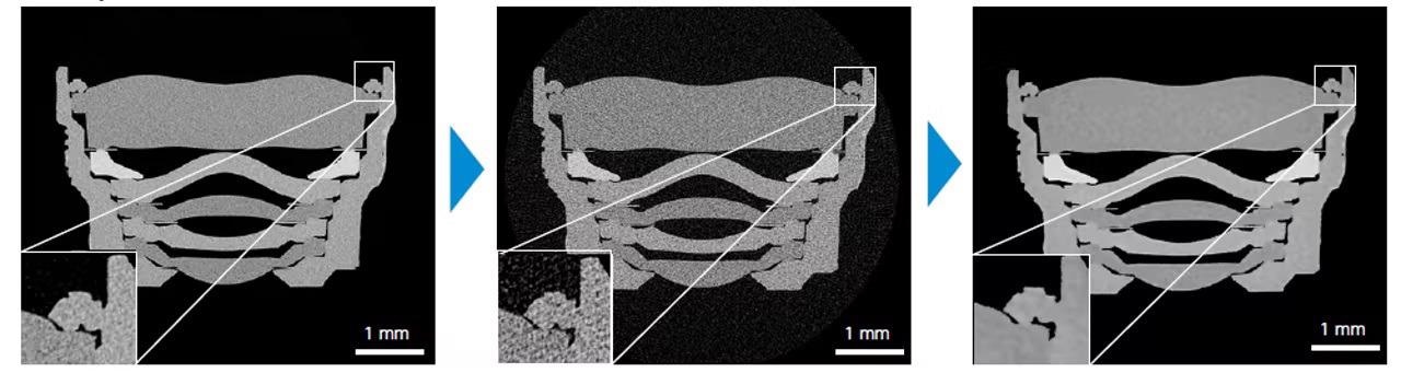 Observe the performance of OptiRecon in a workflow performed on an electronics sample. Analyze integration issues in a smartphone camera lens, now 4× faster. Left: Standard reconstruction: Scan time 90 minutes (1200 projections). Center: Standard reconstruction: Scan time 22 minutes (300 projections). Right: OptiRecon: Scan time 22 minutes (300 projections). Image Credit: Carl Zeiss Microscopy GmbH